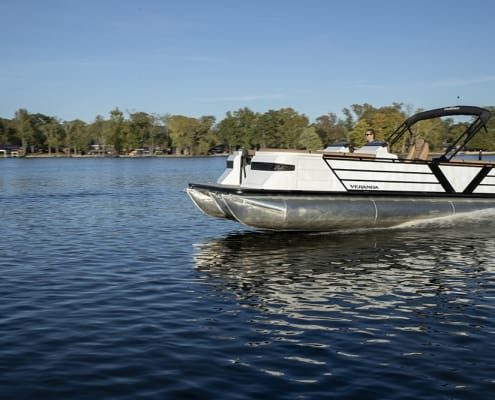 The Veranda Luxury Pontoons 2025 Vertex Series Premium DCRC is available as a tri-toon in two sizes: