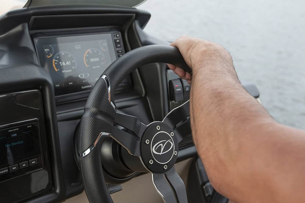 Helm shifter panel with cup holders and fire extinguisher storage, two-tone fence panels, center toon in-floor storage, two high rise hydraulic chair pedestals, power bimini, Garmin ECHOMAP graph multi-function display upgrade with NMEA and digital dash display.
