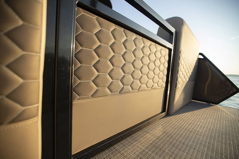 Metallic black powder coat covering of underdeck and pontoons.
