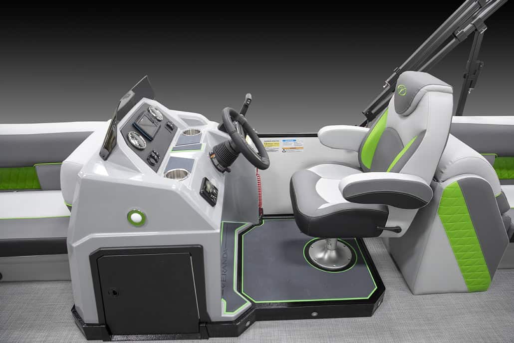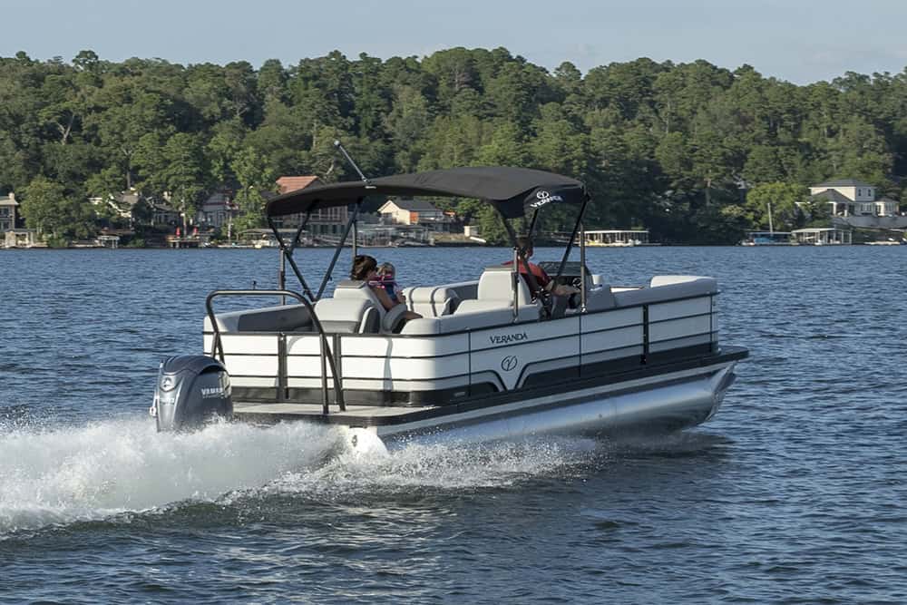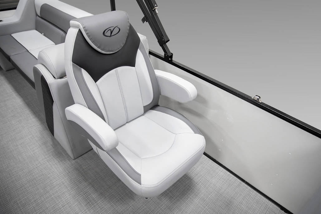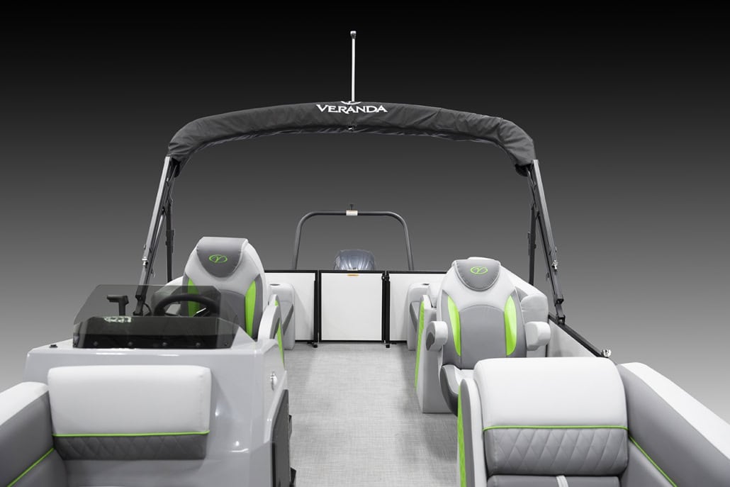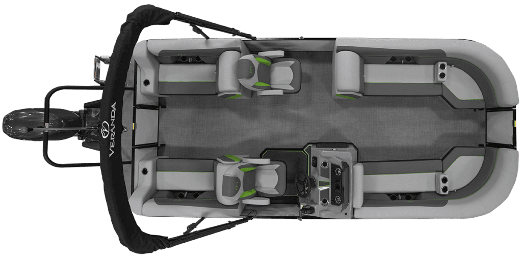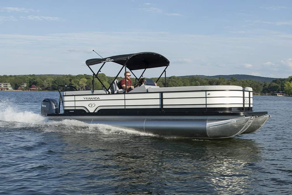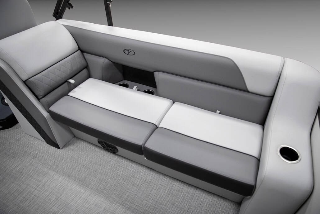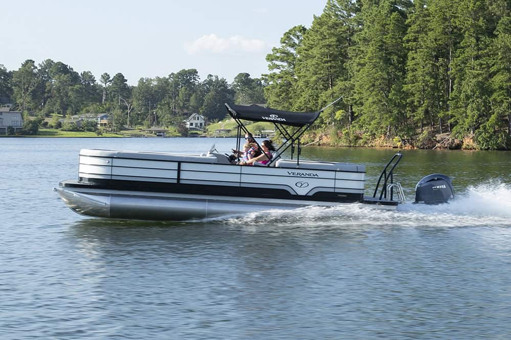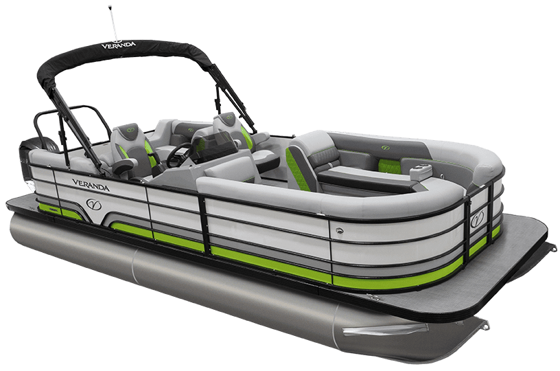 The saying “good things come in threes” hits the bullseye with the Vista Sport. Customers can choose from 20, 22, and 25-foot lengths and black, island green, or navy accent colors. A 25″ Triple-toon Performance Package comes standard and provides greater horsepower and performance. The all-new Vista Sport is ideal for water sports enthusiasts due to the hydraulic steering, tow bar, boarding ladder, and optional Extreme Tower Package. A bundle of luxury standard features will maximize your comfort and entertainment, including reclining chairs and four-corner couch seating in Dolphin Grey, an open storage area under the console for the cooler, a Kicker Bluetooth audio system with four 6.5″ Clarion speakers and an 8″ Bazooka subwoofer, and RGB controller with lighted cupholders at the helm. Captains will appreciate the black powder-coat aluminum and SeaDek-lined raised helm platform and courtesy light when navigating. The Veranda Vista Sport is your affordable and stylish passport to water sports excellence!