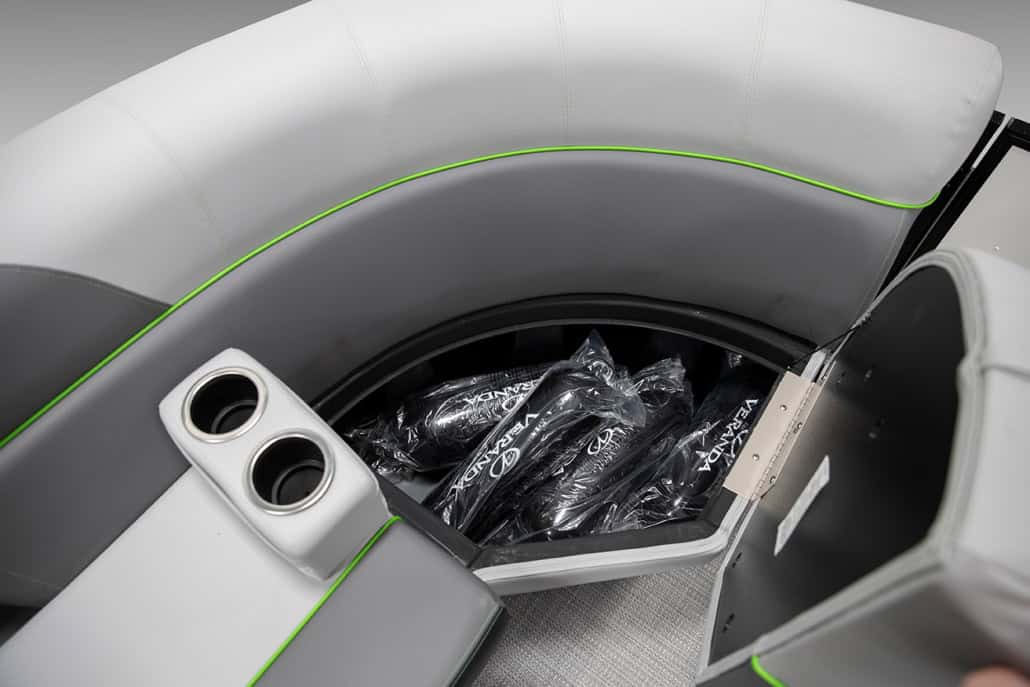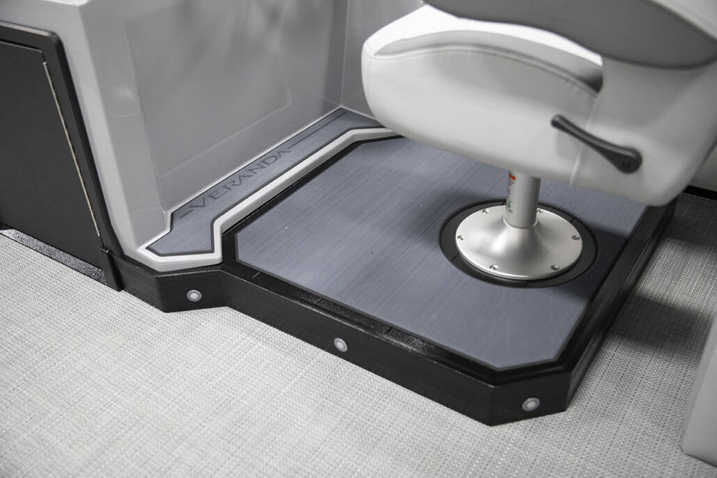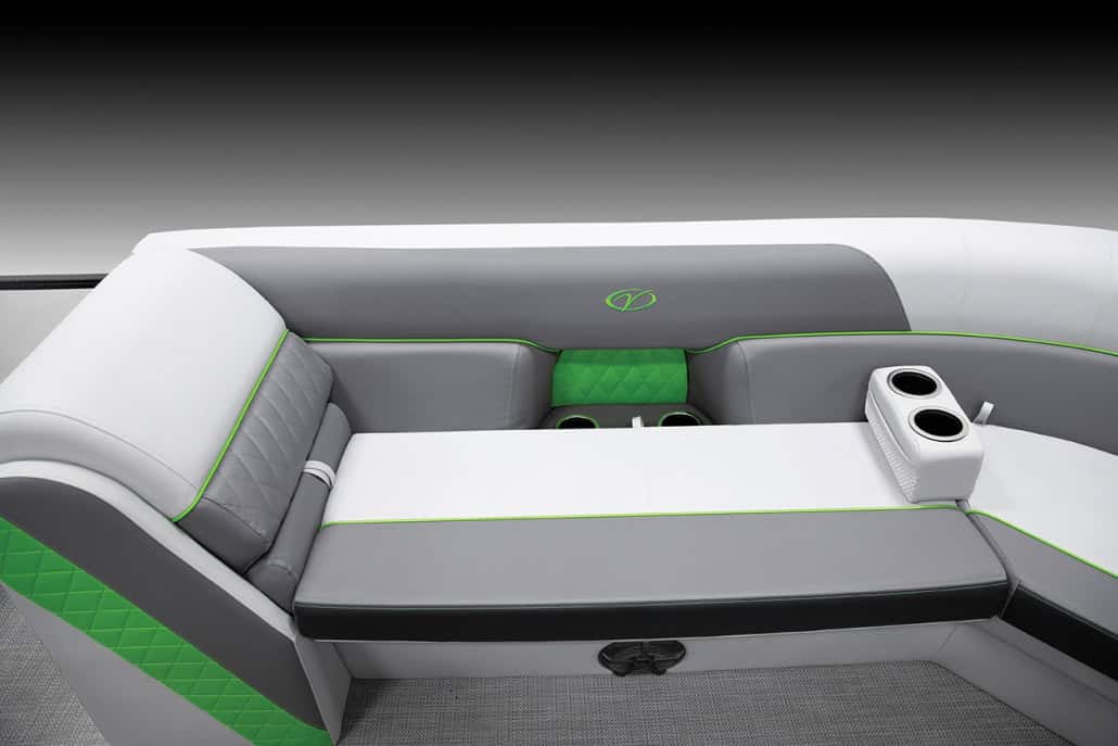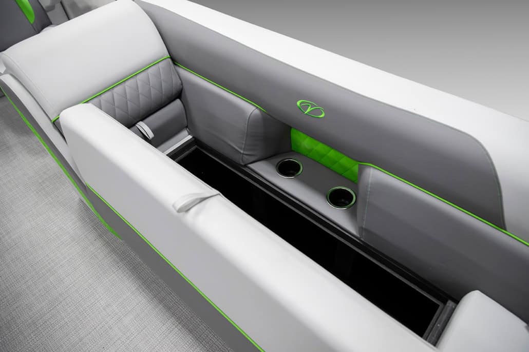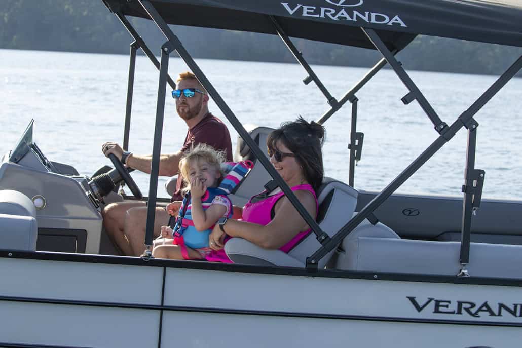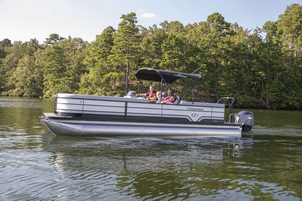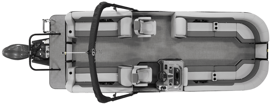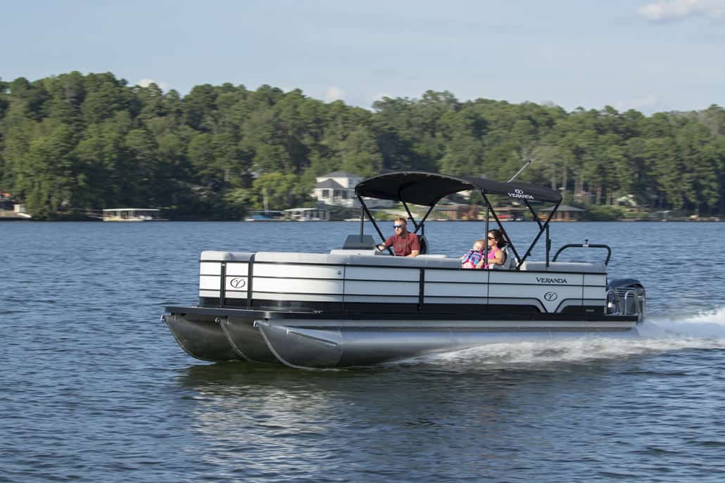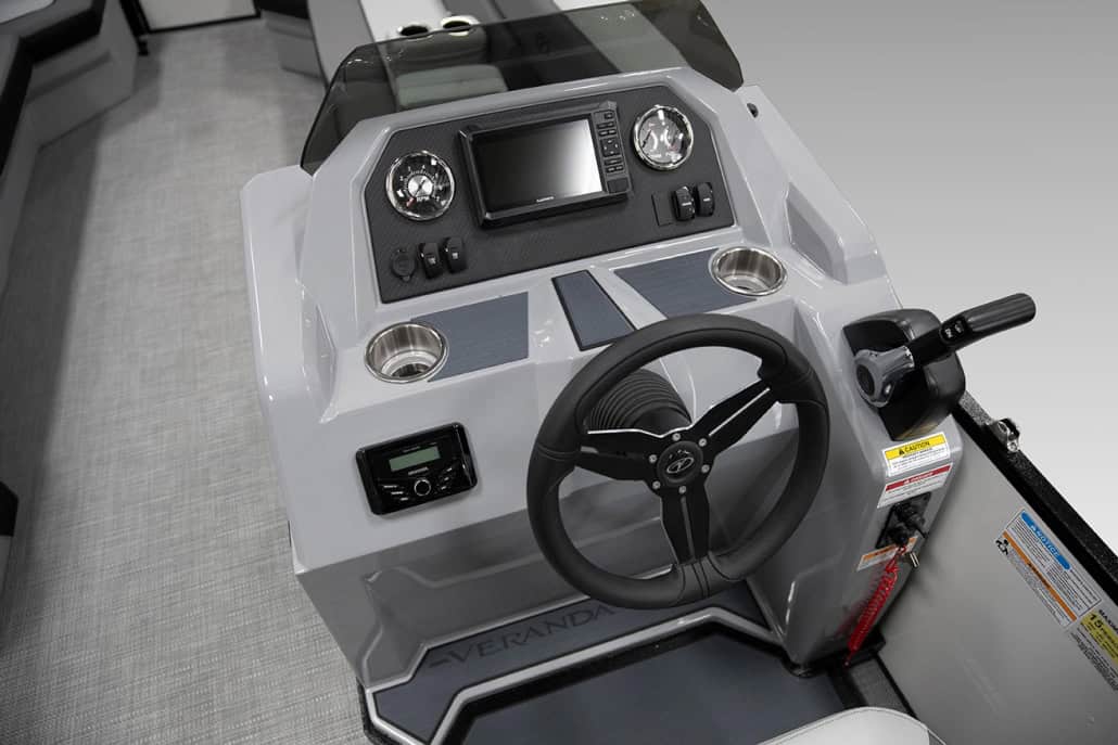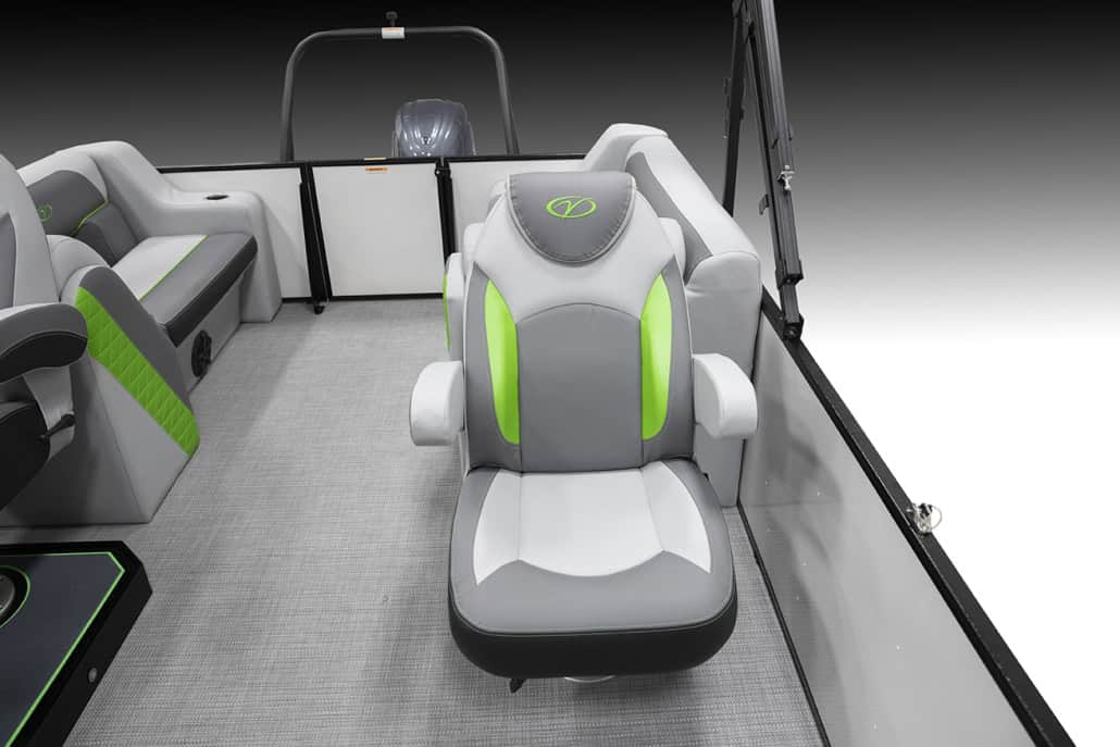 The saying “good things come in threes” hits the bullseye with the Vista Sport. Customers can choose from 20, 22, and 25-foot lengths and black, island green, or navy accent colors. A 25″ Triple-toon Performance Package comes standard and provides greater horsepower and performance. The all-new Vista Sport is ideal for water sports enthusiasts due to the hydraulic steering, tow bar, boarding ladder, and optional Extreme Tower Package. A bundle of luxury standard features will maximize your comfort and entertainment, including reclining chairs and four-corner couch seating in Dolphin Grey, an open storage area under the console for the cooler, a Kicker Bluetooth audio system with four 6.5″ Clarion speakers and an 8″ Bazooka subwoofer, and RGB controller with lighted cupholders at the helm. Captains will appreciate the black powder-coat aluminum and SeaDek-lined raised helm platform and courtesy light when navigating. The Veranda Vista Sport is your affordable and stylish passport to water sports excellence!